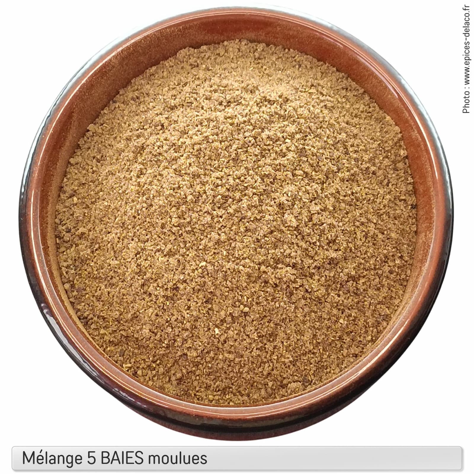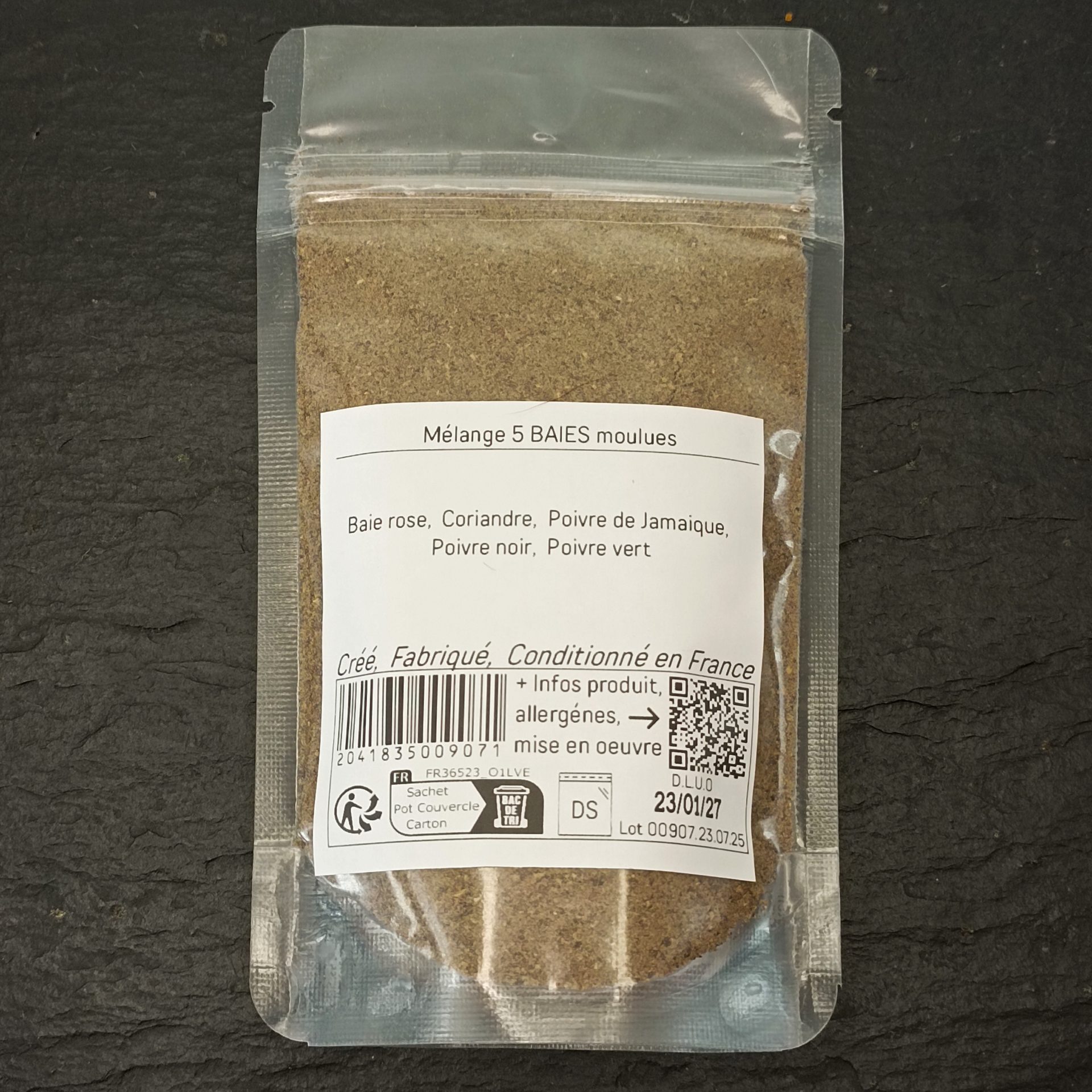 Notre mélange 5 BAIES moulues est un mélange d’épices composé de cinq types de baies différents : la coriandre, le poivre noir, le poivre vert, les baies roses rose et le poivre de Jamaïque (aussi connue sous le nom de piment de la Jamaïque). Ce mélange est souvent utilisé pour assaisonner les viandes, les poissons, les légumes et les soupes.